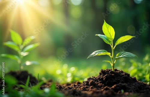 Young green plant sprouts from rich soil, surrounded by plants, sun rays. New life begins, representing growth, sustainability, eco-friendly practices. Nature resilience shines in close-up photo.