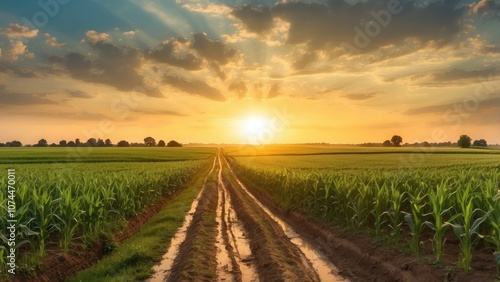 During the golden hour sunset, a dirt country ground road is situated between two corn fields in a rural setting. Harvest season, cob leaves, green plant maize, farming land expansion,...-