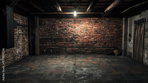 Ciemna piwnica z ceglaną ścianą i szorstką podłogą tworzy nieco mroczny, ale intrygujący klimat.