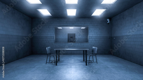 Empty interrogation room. Lights on at investigation room with surveillance camera recording and fake mirror. 3d render.