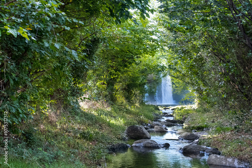un ruscello scorre attraverso un tunnel di alberi illuminati dal sole.