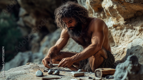 A primitive man focuses intently on crafting stone tools in a cave, showcasing survival, ancient skills, and the resourcefulness of early humans in the wild.