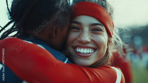 Dwóch zawodników ściska się serdecznie po intensywnym meczu, uśmiechnięci i pełni radości. To chwila zwycięstwa, gdzie radość i duma z osiągnięcia wspólnego celu są wyraźnie widoczne na ich twarzach.