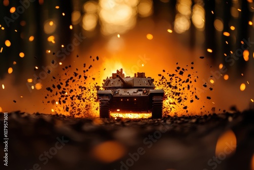 A model tank creates dynamic sparks and debris against a glowing background, evoking a dramatic, fiery atmosphere in a forested setting.