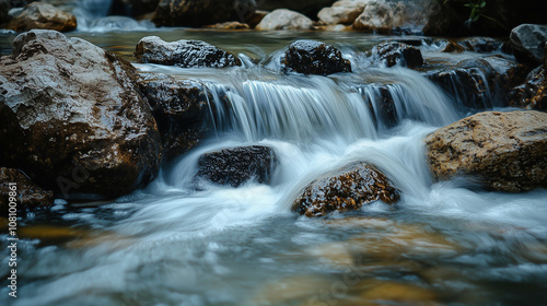 Woda płynie delikatnie po gładkich, ciemnych kamieniach, tworząc harmonijny kontrast między jasnym nurtem a kamienistym podłożem.