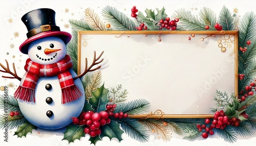 Tło bożonarodzeniowe z bałwanami, gałązkami świerku, czerwonymi jagodami, szyszkami i ozdobami świątecznymi otaczającymi białą kartkę papieru lub baner