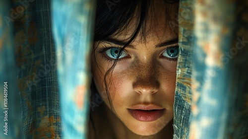 paranoia in home, a woman at home, nervously securing locks and peeking through curtains, sensing a surveillance presence as eyes subtly materialize in the wallpaper