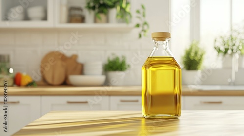 Glass Bottle of Cooking Oil on a Wooden Countertop in a Kitchen