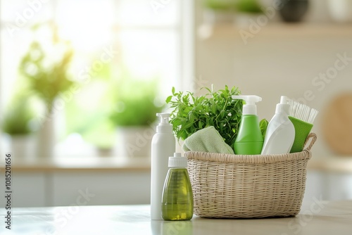 Eco-friendly cleaning products, a green towel, a brush, and a plant in a basket, representing sustainable and natural cleaning options for a healthy home and environment