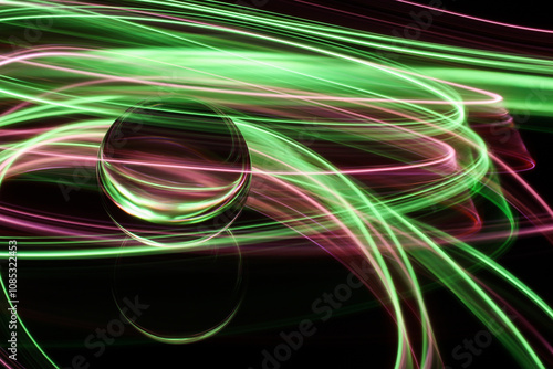 A long exposure photograph. Light painting photography. Swirls of colourful light behind and around a glass ball on a mirror.
