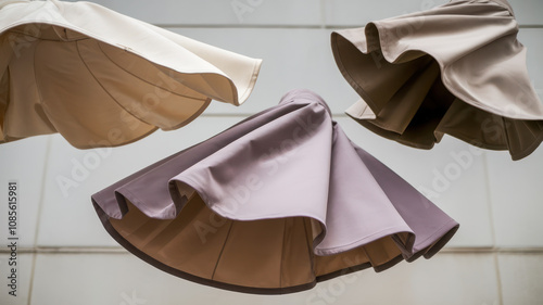Three elegant, flowing skirts in neutral tones suspended in mid-air, showcasing their intricate designs and lively movement against a soft backdrop.