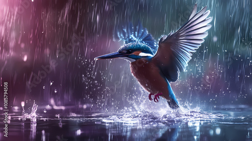 Magnificent kingfisher halcyon bird with wings spread taking flight bathing in the rain photo illustration, wildlife, animal, ai. Halcyon. Illustration