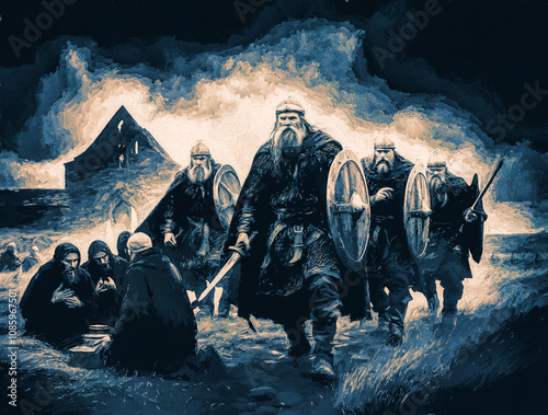 Wikinger ziehen in die Schlacht, umgeben von einer rauen Landschaft und mystischen Wolken