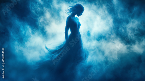 Mistyczna sylwetka, delikatnie ukryta w oparach błękitnej mgły, wydaje się unosząca w mroku, tworząc atmosferę pełną magii i tajemnicy.