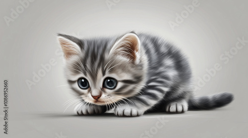 Mały kotek patrzy z zainteresowaniem, emanując urokiem i zabawnym, psotnym charakterem, gotowy do odkrywania otoczenia.