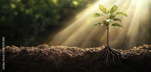 A small tree sapling rooted deeply in the soil with sunlight streaming through its leaves, symbolizing stable growth and development.