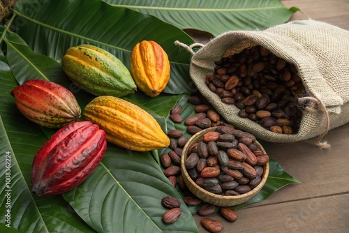 Frische Kakaoschoten und Bohnen auf Kakaoblättern