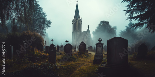 Cmentarz otulony gęstą mgłą, z wiekowymi nagrobkami na tle monumentalnych wież kościelnych.
