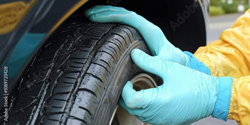 Dłonie w ochronnych rękawicach dokładnie analizują stan bieżnika opony w plenerze, ukazując praktyczne podejście do dbania o bezpieczeństwo na drodze.