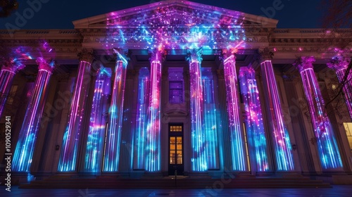 Colorful light projections on a classical building at night.
