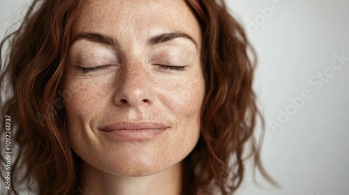 Portrait of a serene woman in her forties with curly red hair and closed eyes, set against a clean white background, exuding calmness and tranquility.
