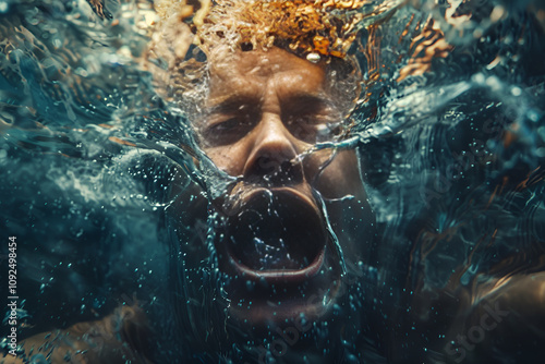 Dramatyczne ujęcie osoby zanurzonej w wodzie, uchwycone w momencie krzyku lub desperacji.