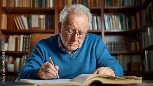 Elderly Man Thoughtfully Writing Memoirs in Cozy Study with Bookshelves