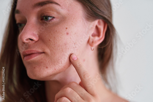 Young girl with oily problem sensitive facial skin suffering from acne, post-acne, cosmetology and dermatology