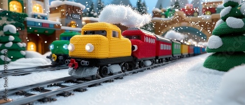 Knitted Toy Train on Snowy Winter Landscape