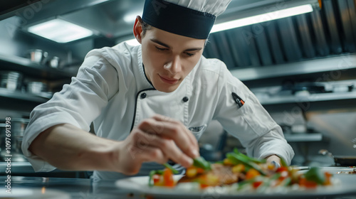 Cook decorating a dish with care, adding the finishing touches in a modern kitchen.