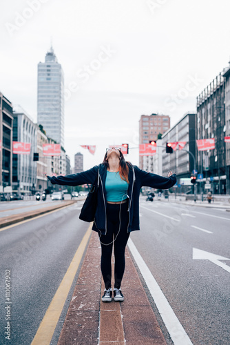 young handsome caucasian reddish straight hair woman in the middle of the street with arms wide open - freedom, girl power, goal concept