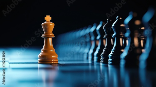A golden king chess piece stands out in front of a line of black pieces, emphasizing strategy and competition in a dramatic, low-light setting.