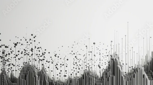 A dynamic black and white abstract visualization featuring tall vertical lines and scattered spheres, resembling data points in a futuristic 3D landscape. The image conveys a modern, tech-driven