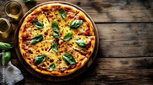 wysokiej klasy fotografia kulinarna, świeżo upieczona pizza, ser mozzarella, liście bazylii, rustykalny drewniany stół, naturalne oświetlenie boczne, ceramiczny talerz, płytka głębia ostrości, Canon E