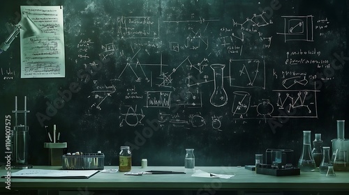 Blackboard background inscribed with physics laws, chemical symbols, and scientific notations