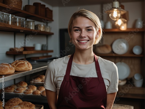 Wesoła, młoda sprzedawczyni z krótkimi blond włosami, uśmiechnięta i zapewniająca doskonałą obsługę klienta w piekarni, w otoczeniu świeżych wypieków.
