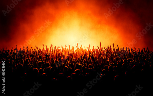 A crowd of people are gathered together in a dark room with a bright orange light in the background. Scene is energetic and lively, as the people are all raised up in the air