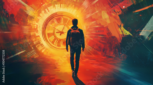 Young man using backpack walking to surrealistic clock, time travel concept. generative ai image. Temporal. Illustration