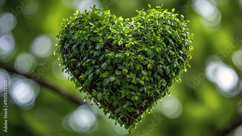 Zielona serce z liści wiszące na gałęzi w tle rozmytego drzewa