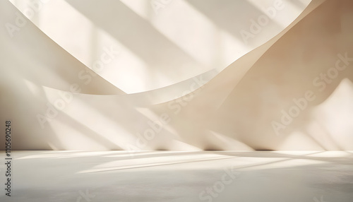 Empty abstract background in neutral beige colors for business product presentation. Geometrical shadows on wall for modern minimalist mockup backdrop.