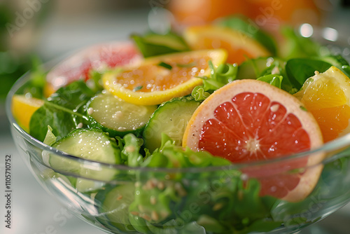 Świeża sałatka w szklanej misce, składająca się z kolorowych składników, takich jak grejpfrut, pomarańcza, ogórek, szpinak i sałata.