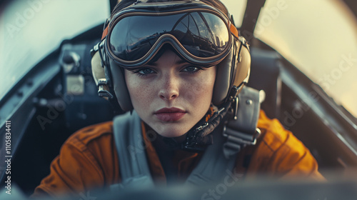 Pilot w goglach i kasku lotniczym, siedzącego w kokpicie z ręką na sterach.
