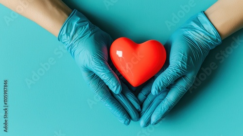 A pair of gloved hands holds a bright red heart against a teal background, symbolizing care, health, and compassion.