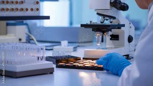 A clinical pathologist examining tissue samples in a pathology laboratory, with histological slides and diagnostic pathology equipment visible, Pathology examination style