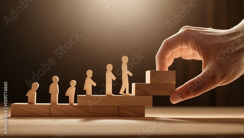 An illustration featuring a series of small, wooden block steps arranged in an ascending order on a wooden surface.