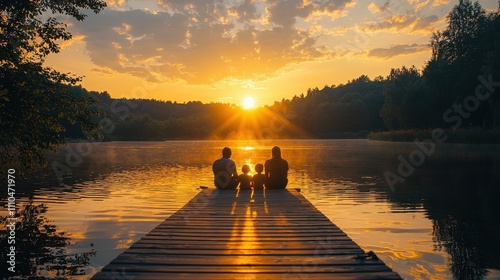 A family sitting on a dock at a peaceful lake during sunset, dipping their toes in the water. The golden light reflects off the lake, creating a serene and magical atmosphere. The moment emphasizes