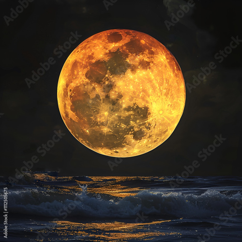 Monumentalna pełnia księżyca w ciepłych, złocistych odcieniach unosząca się nad spokojnym oceanem w ciemności nocy.