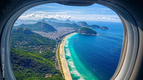 View of Rio de Janeiro's coastline from an airplane window showcasing turquoise waters and vibrant city life