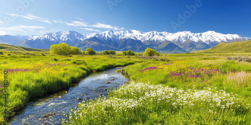 A tranquil mountain meadow in early summer, with a babbling brook cutting through vibrant wildflowers, and snow-capped peaks in the distance under a clear sky. The idyllic and refreshing scene feels