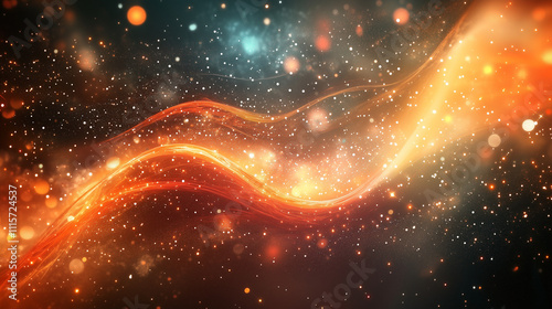 Cyfrowa fala cząsteczek i świecących punktów na abstrakcyjnym tle tworzy dynamiczny obraz o technologicznej estetyce i futurystycznym charakterze.